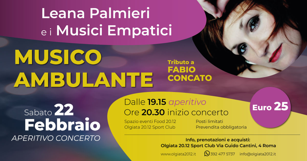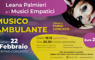 ANNULLATO: Leana Palmieri e i Musici Empatici in “MUSICO AMBULANTE” aperitivo concerto Sabato 22 Febbraio evento speciale all'Olgiata 20.12 Sport Club. Presso lo Spazio Eventi Food 20.12, all'interno del centro sportivo, si svolgerà l'aperitivo concerto con protagonista Leana Palmieri, attrice, regista, cantante e formatrice, coadiuvata dai Musici Empatici. Il Musico Ambulante sarà l'occasione per [...]